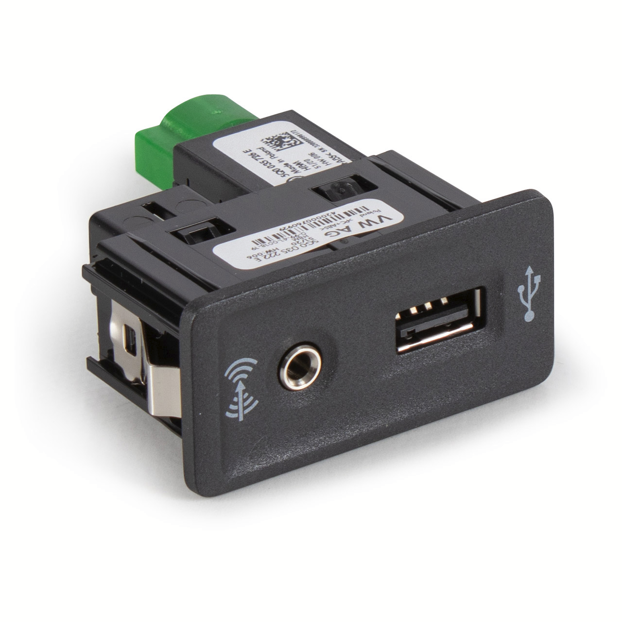 5G0 035 222 E assembly (5Q0 035 726 E USB port + AUX port - long - green connector)