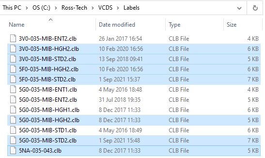 \n In folder C:\Ross-Tech\VCDS\Labels are labels named: \n 3V0-035-MIB-STD2.clb for Skoda MIB2 STD units \n 5G0-035-MIB-STD2.clb for VW MIB2 STD units \n 5F0-035-MIB-STD2.clb for Seat MIB2 STD units \n \n 3V0-035-MIB-HGH2.clb for Skoda MIB2 HIGH units \n 5G0-035-MIB-HGH2.clb for VW MIB2 HIGH units \n 5F0-035-MIB-HGH2.clb for Seat MIB2 HIGH units