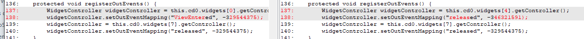 WidgetController widgetController = this.cd0.widgets\[4\].getController(); widgetController.setOutEventMapping("released", -1); widgetController = this.cd0.widgets\[7\].getController(); widgetController.setOutEventMapping("released", -329544375); }