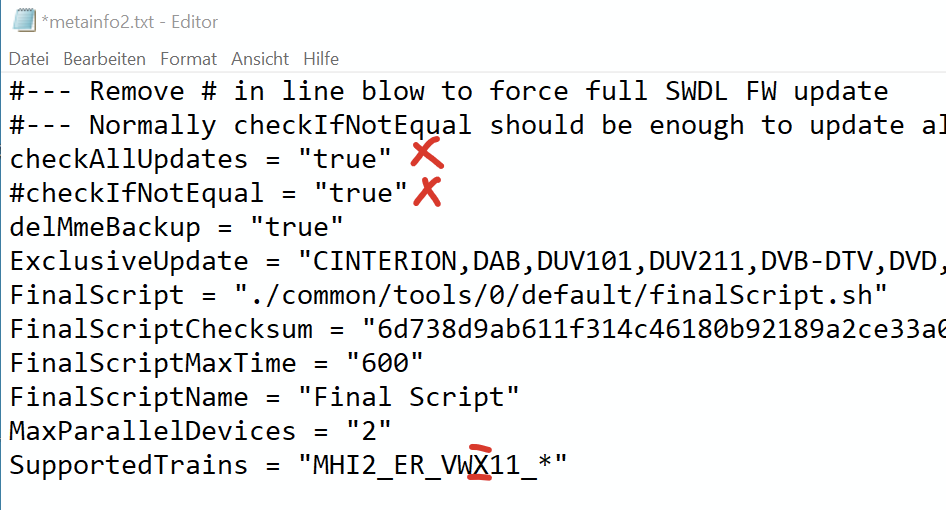 4. Before installation the metainfo2.txt in the root folder of the created SD-Card needs to be modifed as shown here. Changes applied in this case (VW and MIB2 firmware G11):