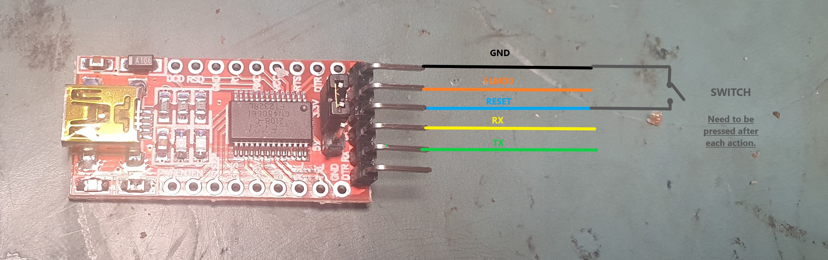WARNING! Do NOT use pin3 of ft232 as RESET and FLMD0 at the same time as the press of the switch will reset the ft232 adapter as well!
