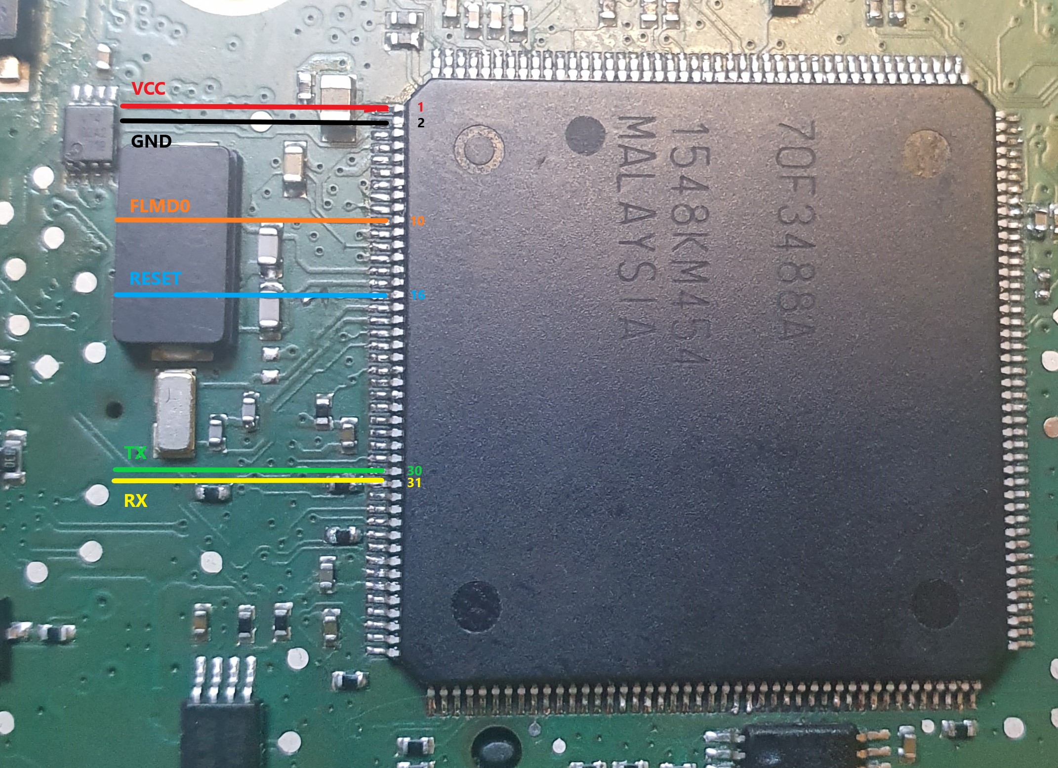 :::info Some MHI2 (like JP AUG22) do not have V850 RST on the 24 pin connector. Use multimeter to find the test pads on the motherboard and directly solder there