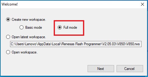 Power on the unit via quadlock, run Renesas Flash Programmer V2.05.03 and use following settings: