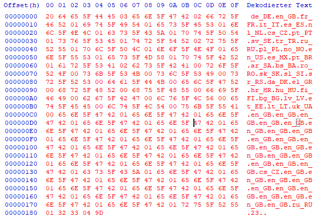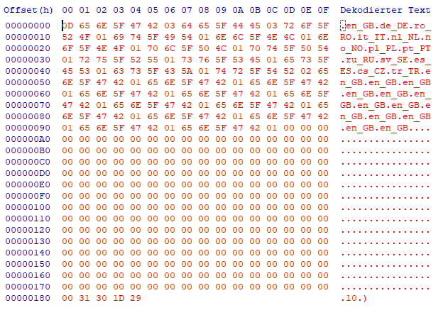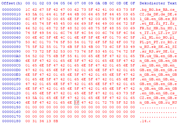 "de_DE,en_GB,fr_FR,it_IT,es_ES,nl_NL,cs_CZ,pt_PT,sv_SE,tr_TR,ru_RU,pl_PL,no_NO,en_US,es_MX,pt_BR,ar_SA,bs_BA,ro_RO,sk_SK,sl_SI,sr_RS,da_DK,el_GR,hr_HR,hu_HU,fi_FI,bg_BG,lv_LV,et_EE,lt_LT,uk_UA"- Offset 181 next two bytes are the dataset version number
