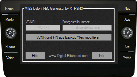 :::info This patch is required to disable the verification of the signature of the FEC containers. \n Open MIB2 Delphi FEC Generator by XTR3M3 and select the appropriate featureenablecodes as desiredand thencreate/save the FEC container (right button). The VCNR and VIN can either be entered manually or imported from an existing (backup) FEC container.